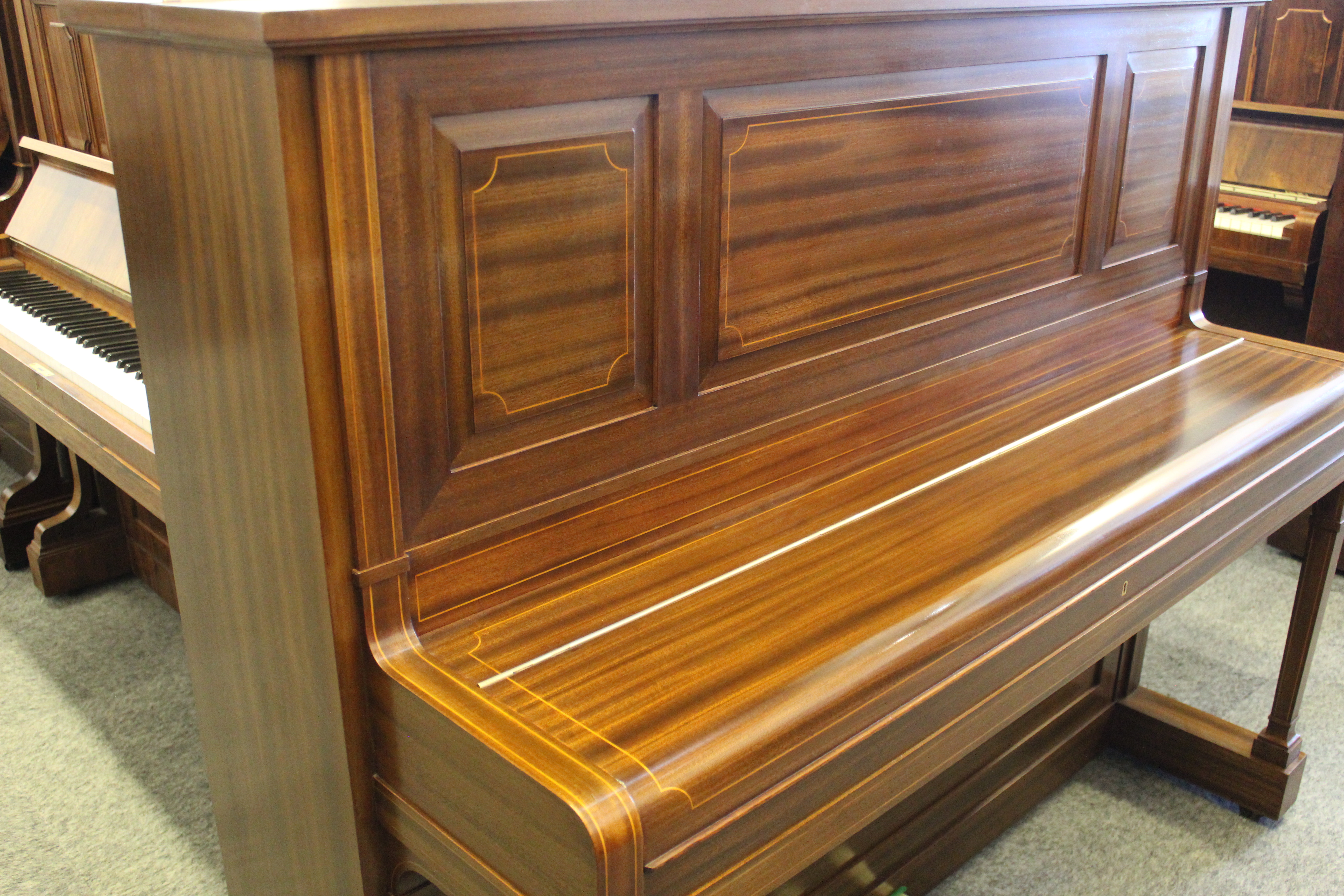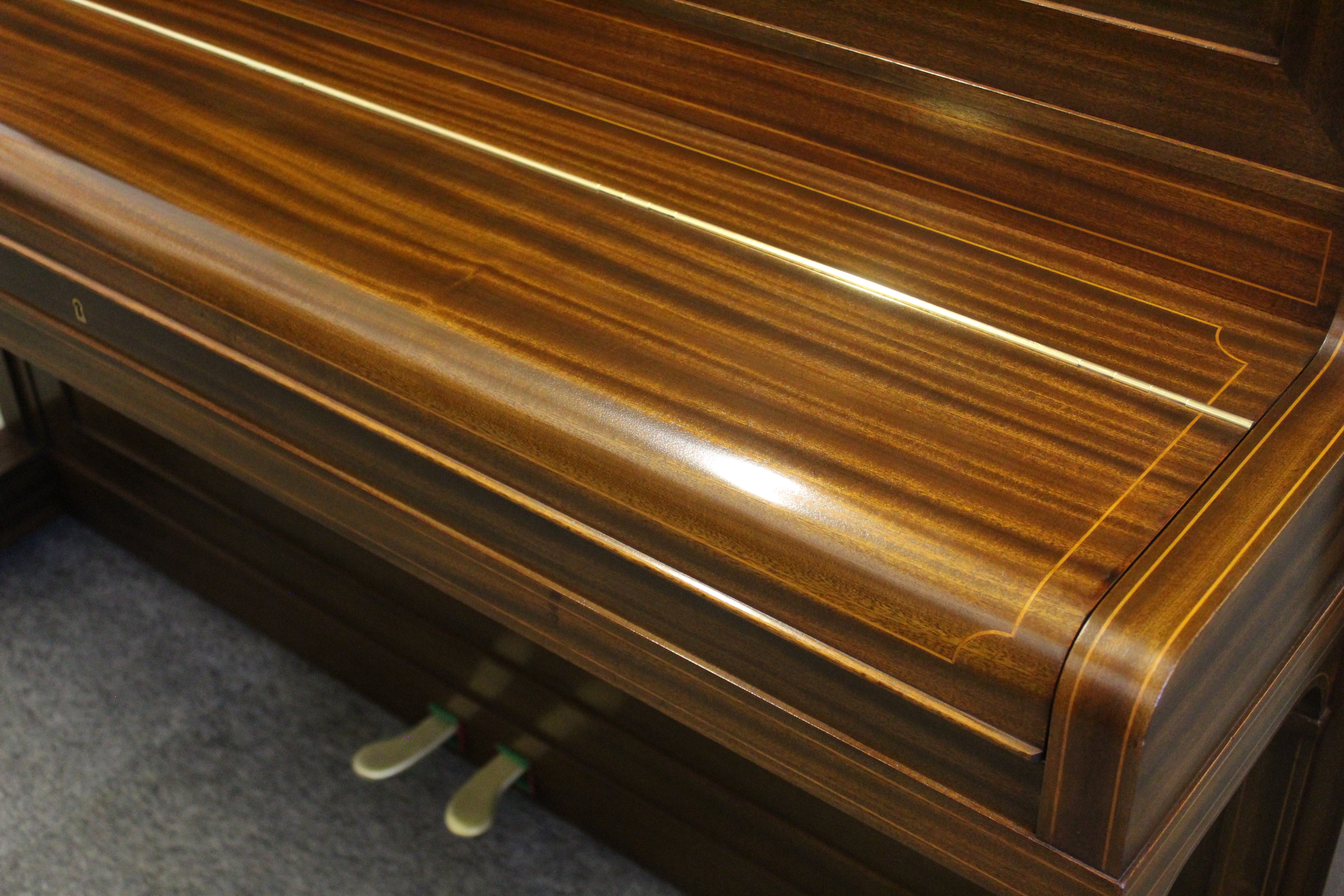 Here we are offering a stunning Bechstein Model 9 in a mahogany case with delicate band inlaid detailing, that our polisher has completely repolished using traditional french polish. The model 9 is the more subtle brother to the slightly larger model 8 in the Bechstein range.