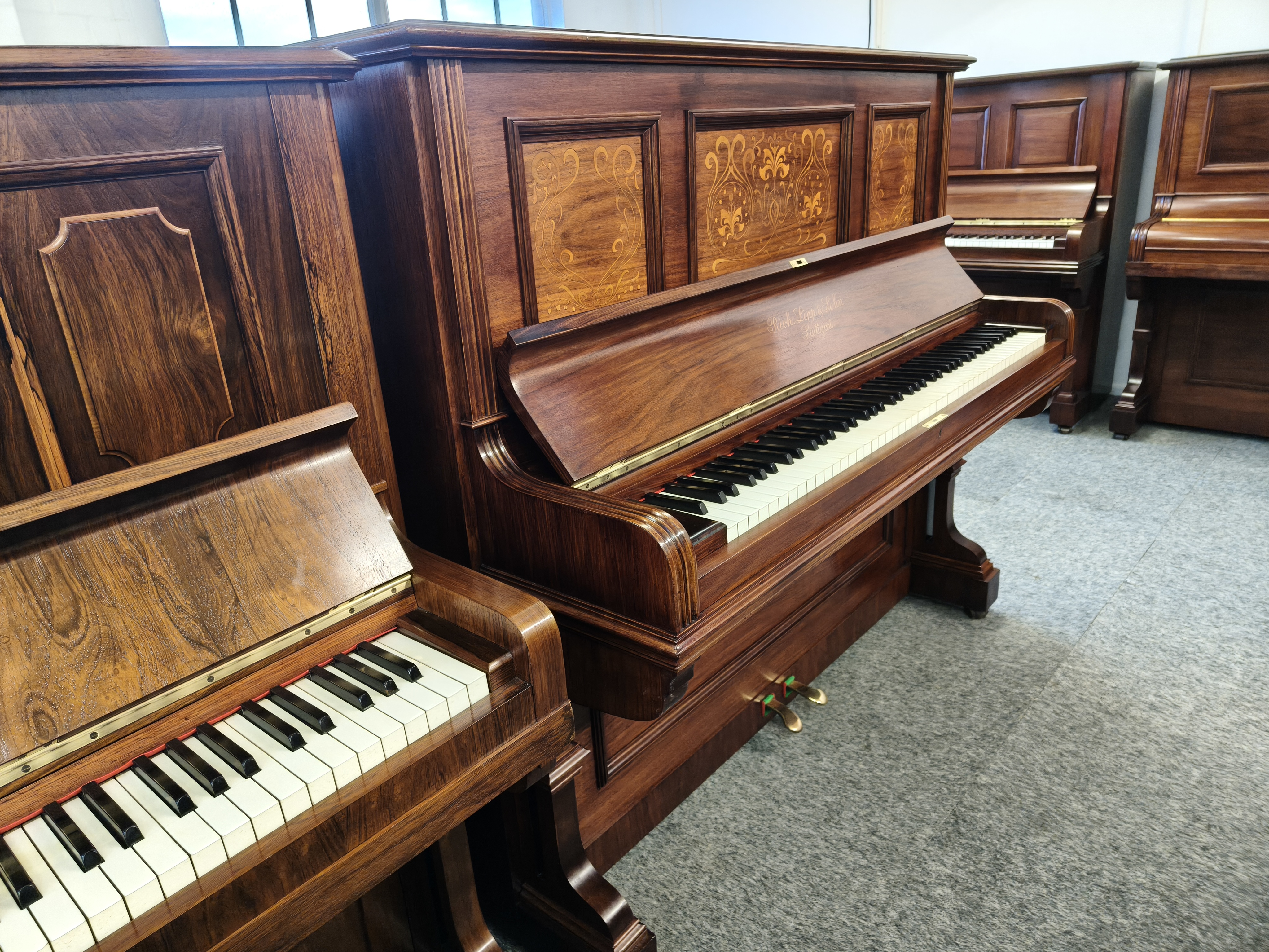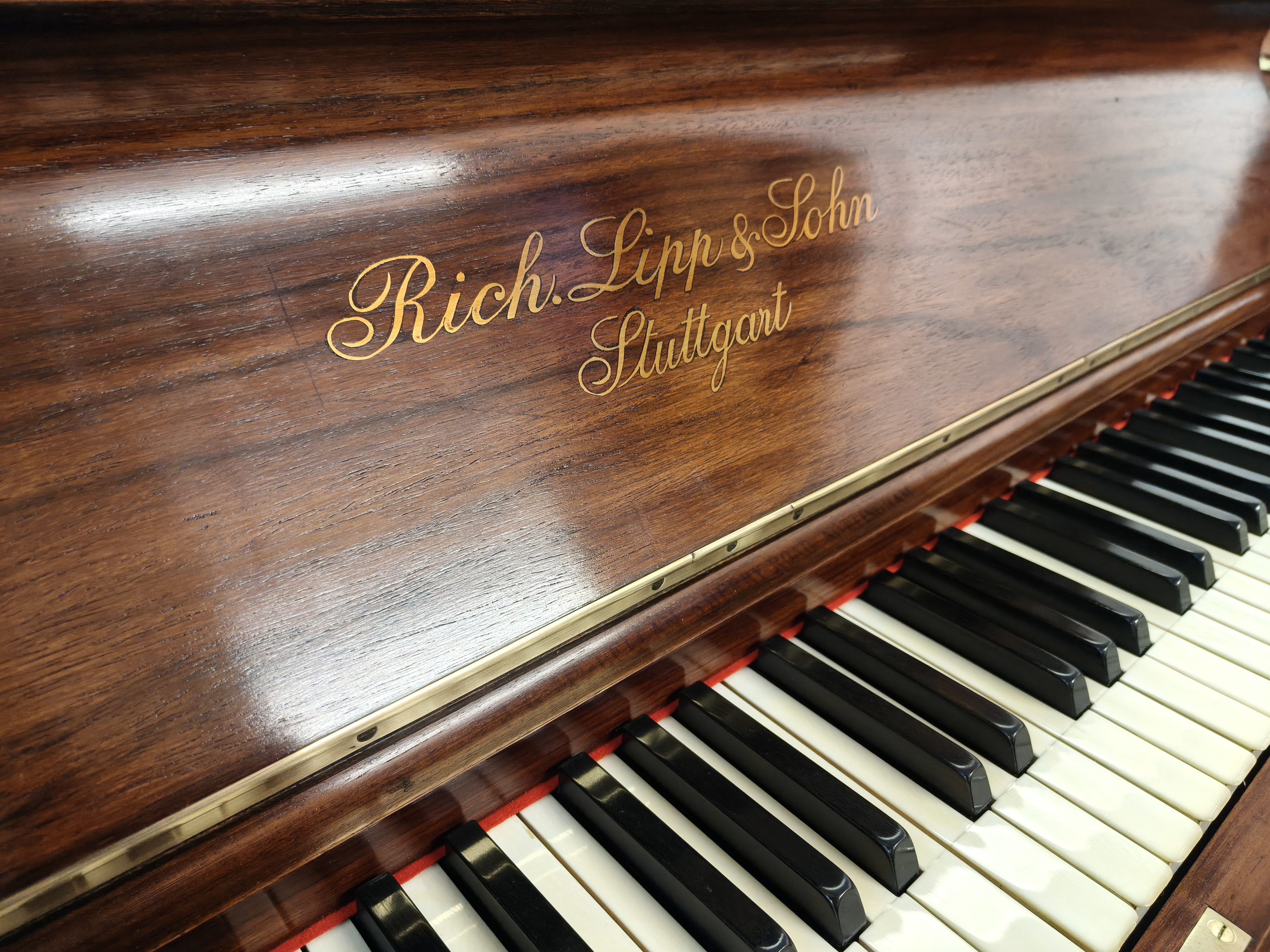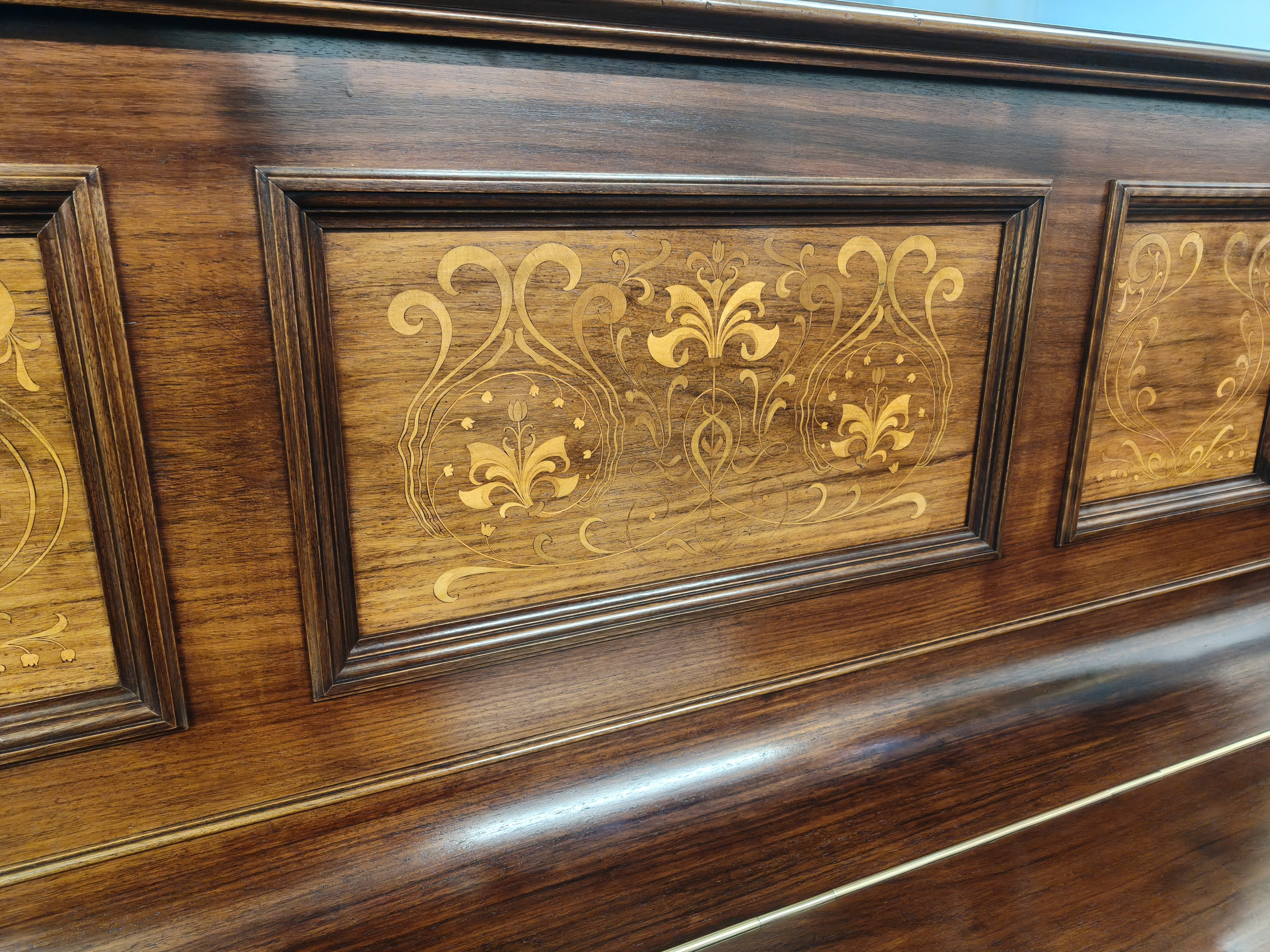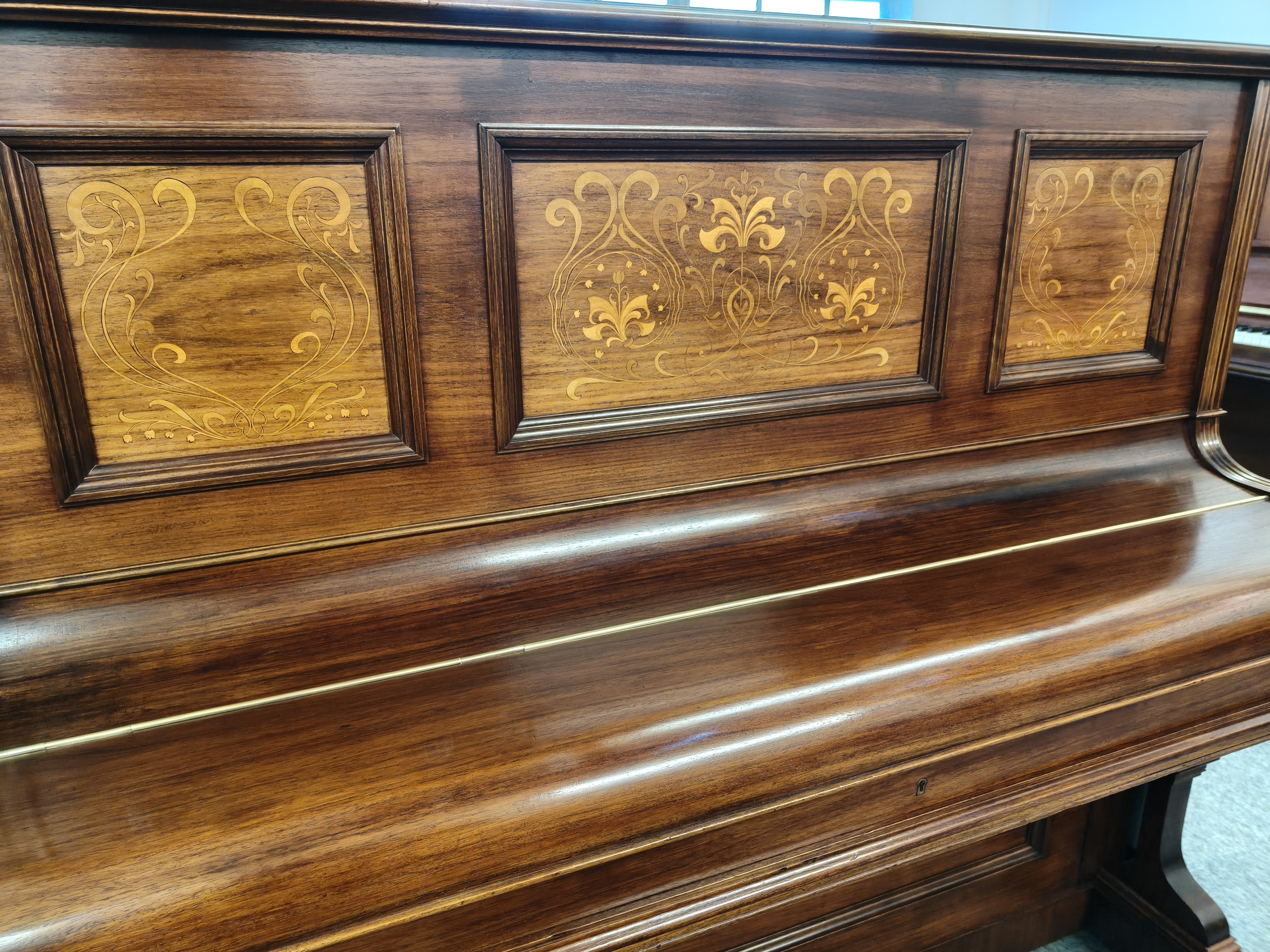 rosewood cabinet, that our expert polisher has restored to its former glory using the traditional hand finishing techniques in keeping with the traditional pianos heritage. The decoratively inlaid fruitwood has been left unstained so the panels stand out to showcase the detailed painstaking work lavished on this instrument when it was hand crafted by Lipp.