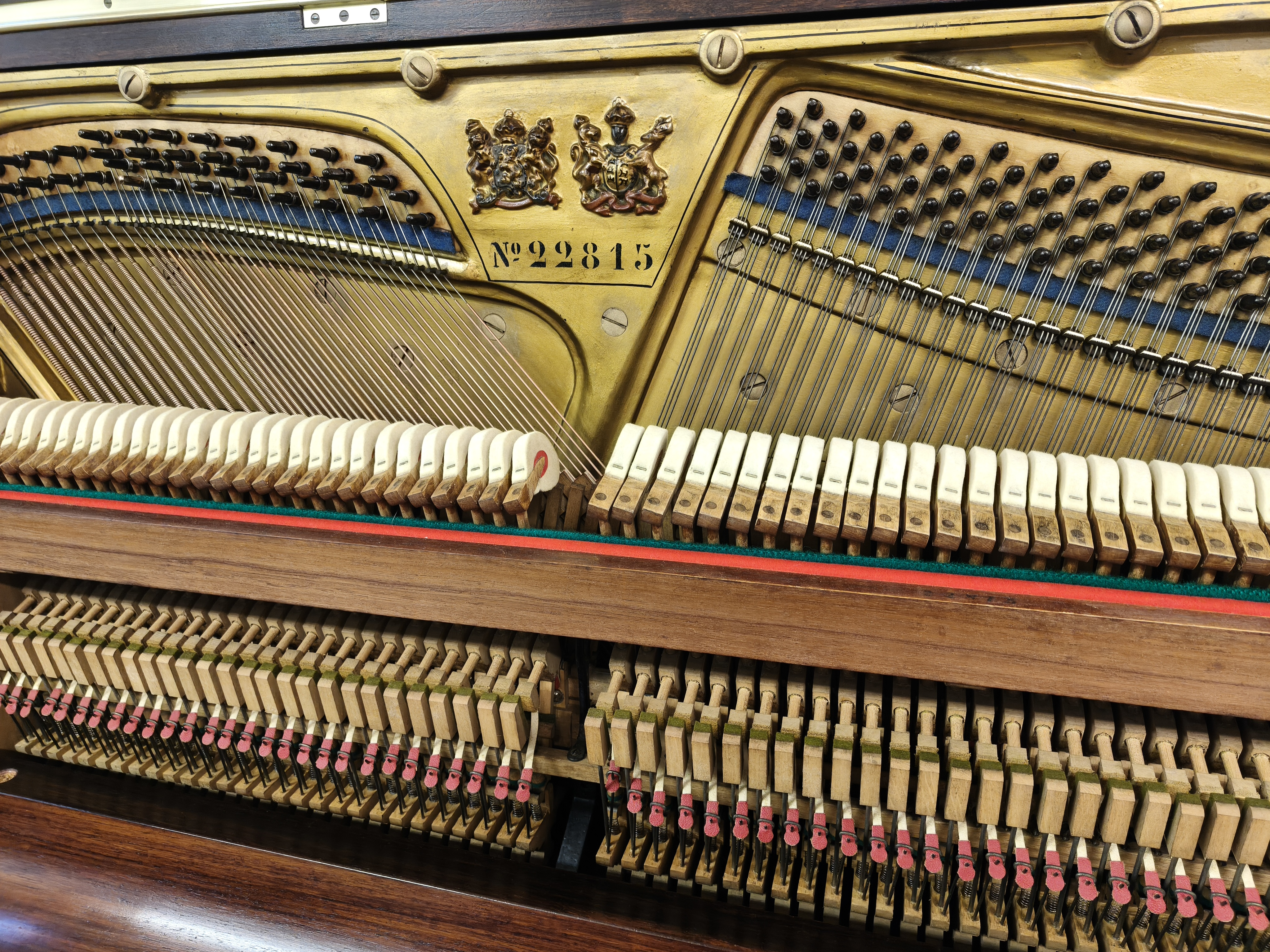 With a full 85 note 7 octave ivory keyboard that our technicians have repolished, overstrung and under/damper action that we have retaped, hammers refaced, hammer rest felt replacement, pedal assembly felt refresh,etc. The serial number for the collectors is 22815